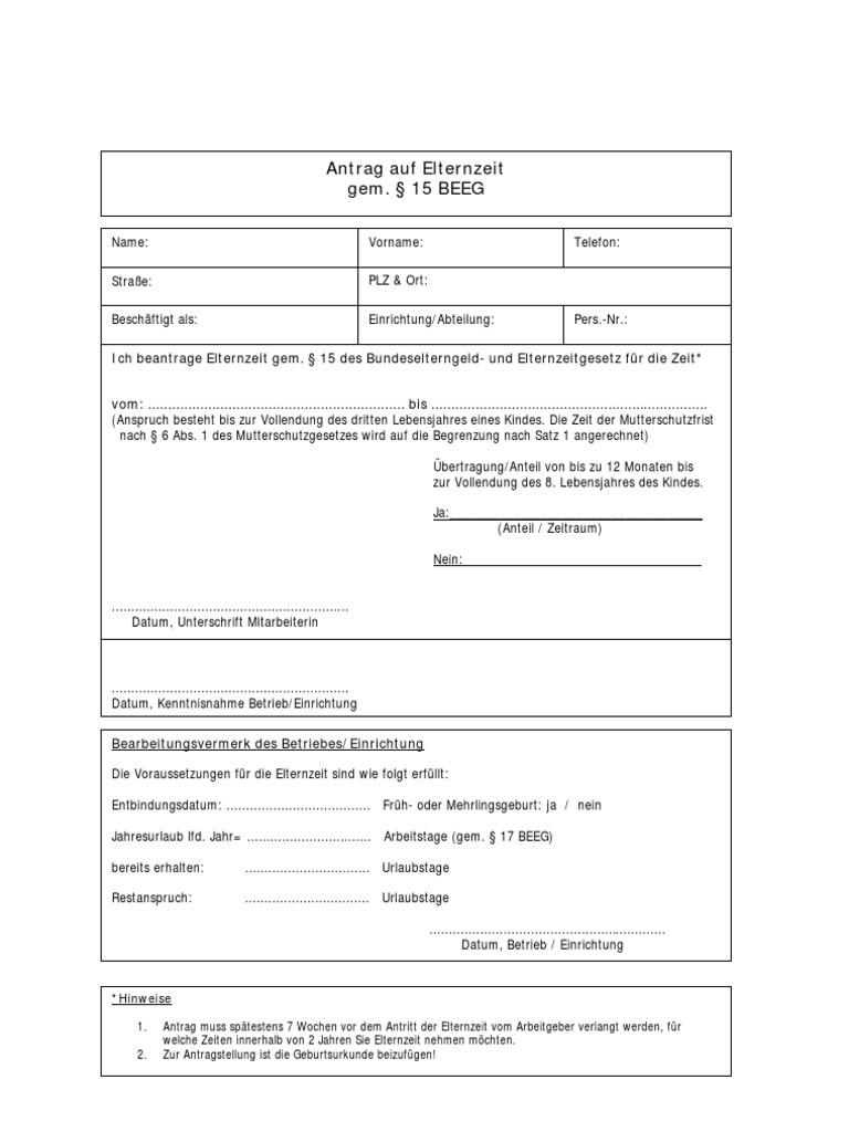 Verschicken sie den antrag unbedingt per einschreiben oder übergeben sie ihn persönlich. Beachten sie jedoch, dass das 2. Die elternzeit muss beim arbeitgeber beantragt werden, und zwar schriftlich spätestens sieben wochen vor beginn. Auf die elternzeit angerechnet wird die frist nach dem mutterschutzgesetz, also die zwei monate nach der geburt des kindes. Theoretisch können väter bis zu drei jahre lang eine auszeit vom job nehmen, für bis zu zwölf monate davon können sie elterngeld beziehen.